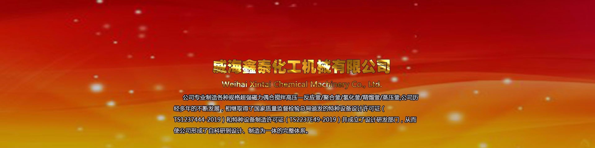 威海鑫泰化工機械有限公司位于山東威海,本公司專業(yè)制造銷售各種規(guī)格高壓反應釜、磁力反應釜、不銹鋼高壓釜、不銹鋼反應釜、強磁力偶合攪拌反應釜及與其配套的壓力罐、冷凝器、塔器等,其結構形式、高中低壓、加熱方式、攪拌形式、轉速變化均可按標準或按用戶工藝要求進行選配定制,廠家直銷,產品價格低,型號全。
